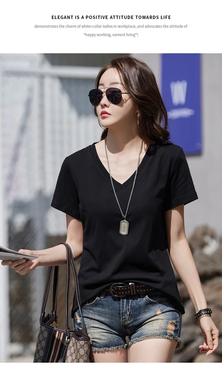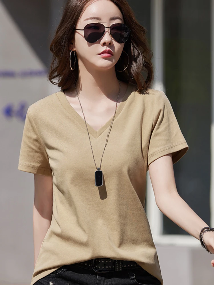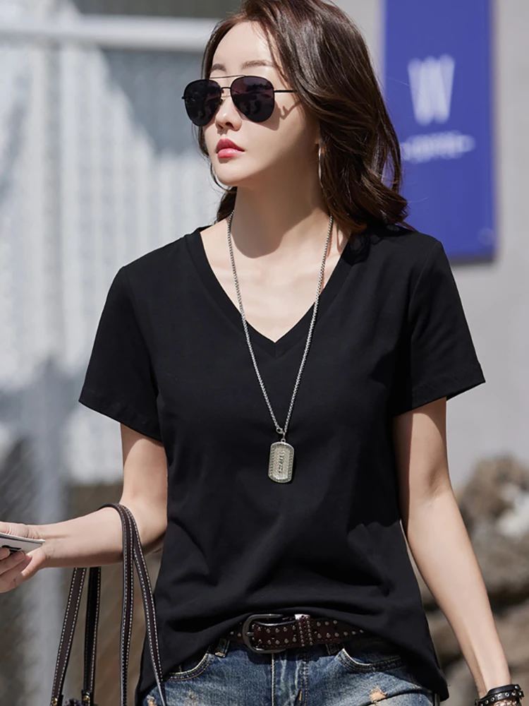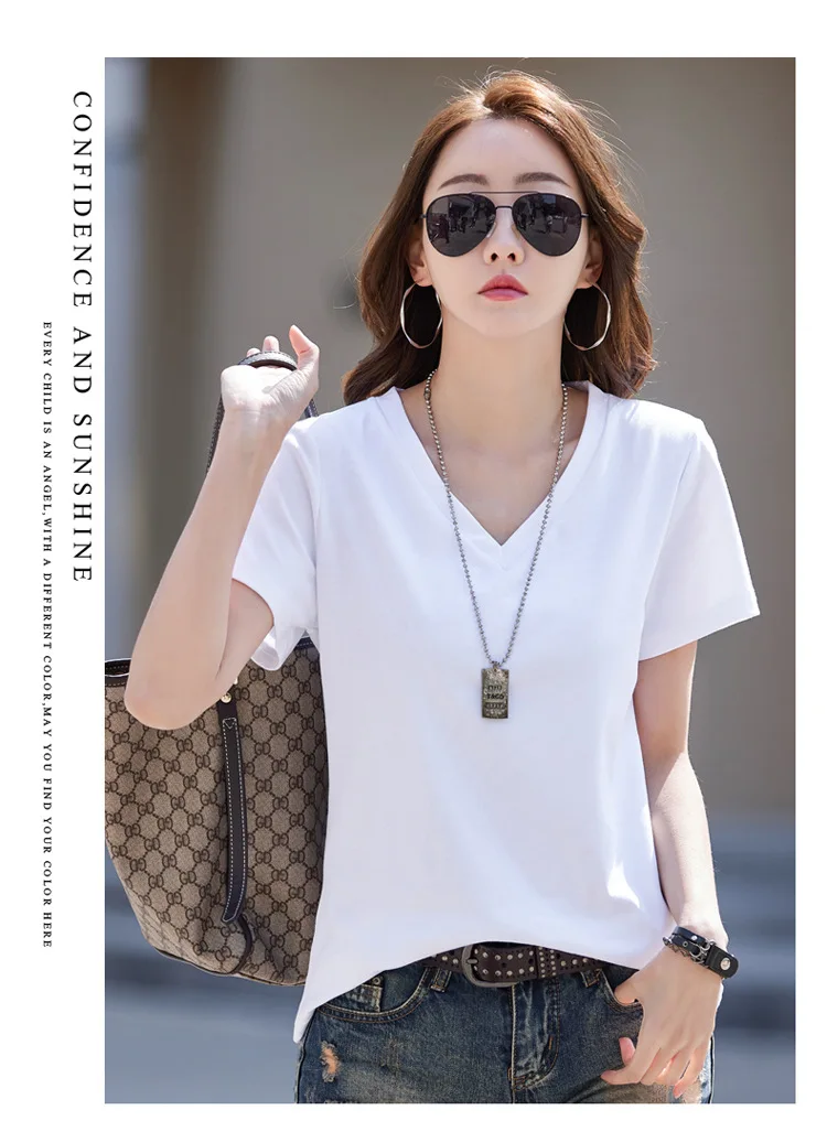 T-shirt en coton Pour Les Femmes Tops Mode Coréenne Col En V Lâche Manches Courtes T-shirt Femme Basique Décontracté T-shirt D'été Dames Vêtements